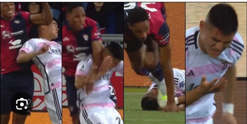 CAGLIARI – Absurd refereeing episode in Cagliari-Juventus, with the result 0-0, starring Carlos Alcaraz. The young Argentine midfielder, who arrived at Juventus in January from Southampton on loan with the right to buy, after just six minutes was brought down in the Cagliari area by Yerry Mina in a very violent manner, with an elbow in the face with very wide arms from the rossoblù defender. Hit in the head, ‘Charlie’ had to temporarily leave the pitch, injured in the head and bleeding, returning only after being treated.