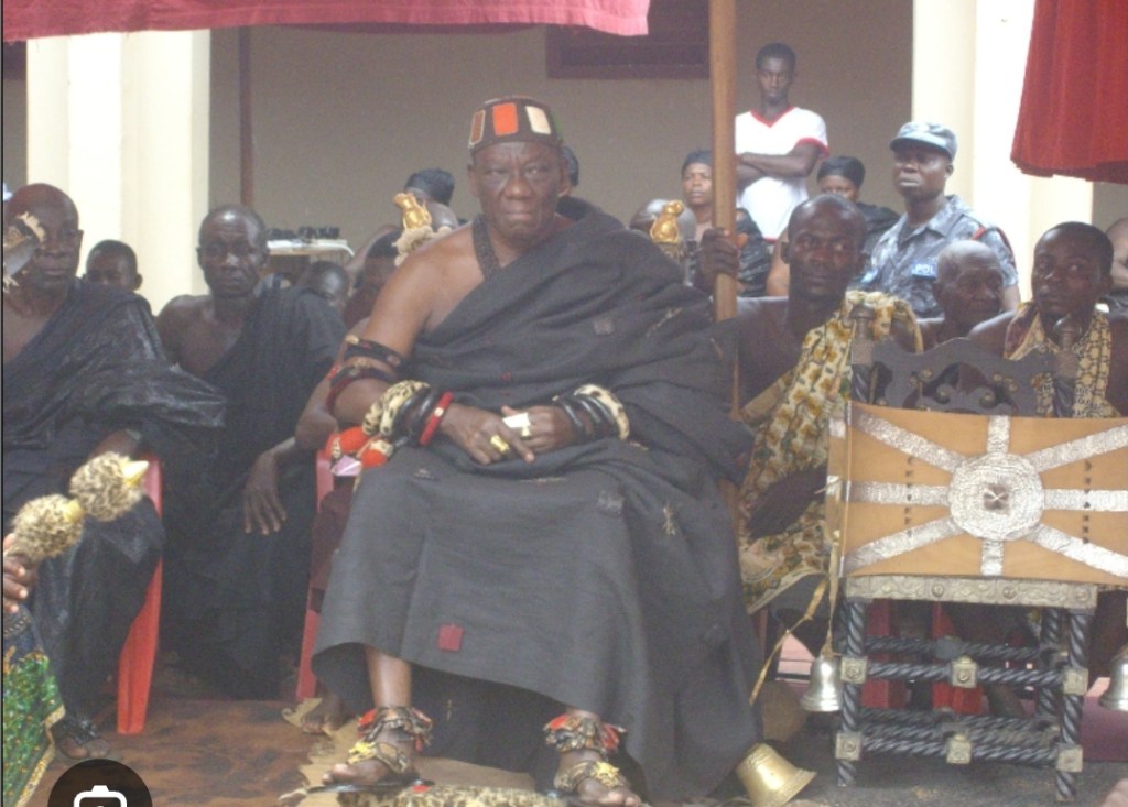 The three bells according to tradition represent the three royal houses in the Mampong traditional area. The gathering must always stand-up to show respect to the Silver-Stool when it appears in public. When it appears in public, it is placed on Asipim stool on the immediateleft side of Mampong-hene.